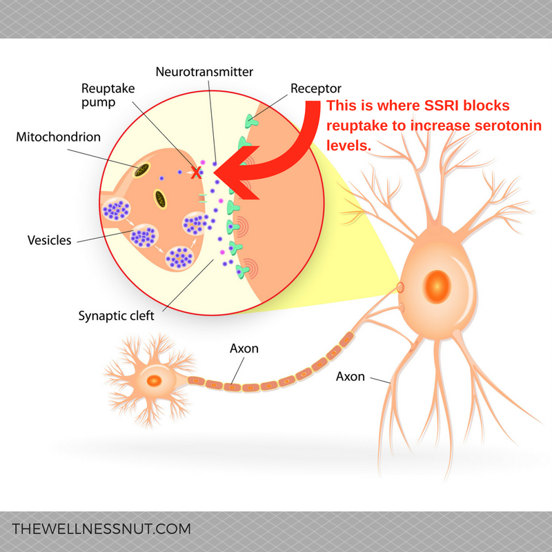 The most common medication prescribed to patients with anxiety is a SSRI or a Selective Serotonin Reuptake Inhibitor. Now let’s talk a little science, but I promise not too much. In your brain you have neurons that speak to each other, they each have neurotransmitters that they release to other neurons. This release of neurotransmitters lets each of the neurons know how to be feeling and once they have given the message or signal they will go back in the neuron to recharge until they can be used again. People with anxiety show a lower level of serotonin, the calming and happy neurotransmitter, in their brain so doctors prescribe medications that will block some of the serotonin from going back in the neuron. This allows the serotonin they have in their neurons to stay outside of the neuron longer, continuing to give the message of being calm and happy. This makes it feel like the patient has more serotonin in their brain then they actually do. So here is a picture to show you what I mean.